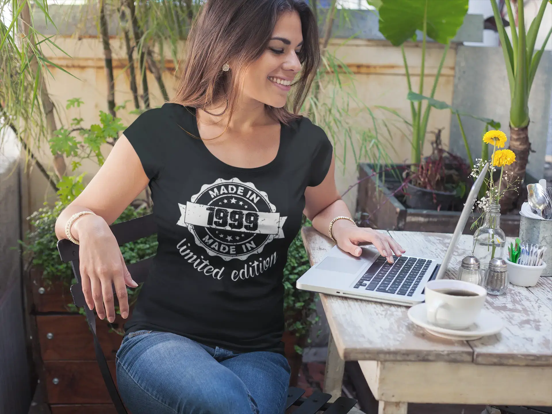 Made in 1999 Limited Edition, Black, Pretty t-shirt, 100% cotton, available in sizes XS, S, M, L, XL. This model is tight. Garment care: hand wash and machine washable. We respect the environment! The t-shirts are created with ink ecological solvent-free water containing no dangerous materials. The ink is perfectly resistant to washing and has a very soft touch. Our inks are Oeko-Tex standard 100. Measurements: XS: half chest 15,5 inch/39 cm, total length 22,75 inch/58 cm S: half chest 16 inch/41 cm, total length 23,5 inch/60 cm M: half chest 17 inch/43 cm, total length 24,5 inch/62 cm L: half chest 18 inch/46 cm, total length 25,25 inch/64 cm XL: half chest 18 inch/46 cm, total length 25,25 inch/64 cm